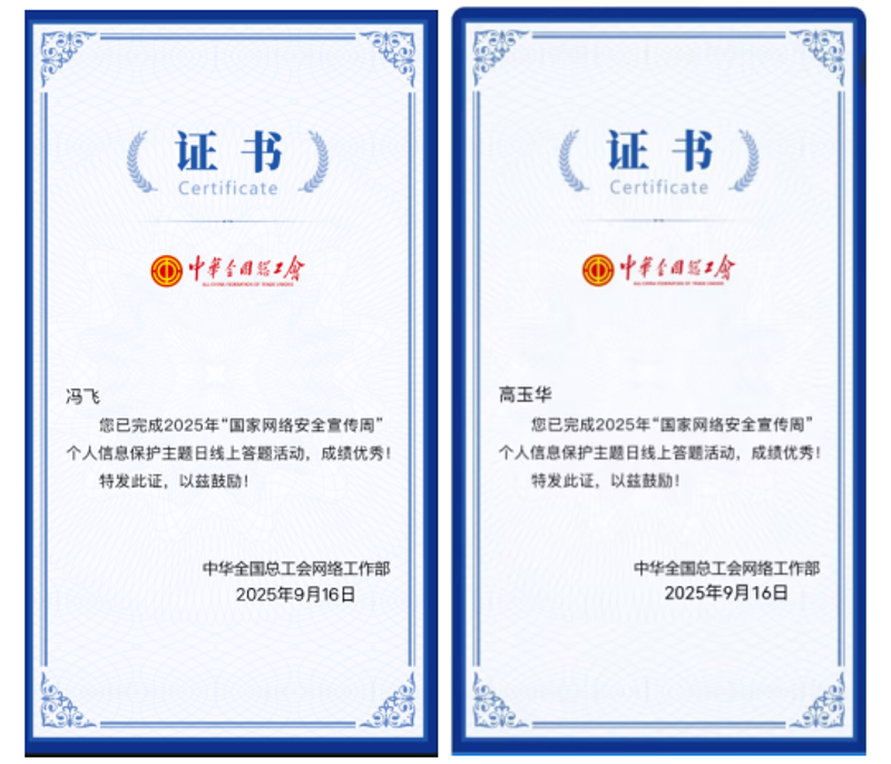 本次云南省2025年国家网络安全宣传周线上答题活动时间为9月15日至9月23日21时。活动期间,每次答题从题库中随机抽取5道题目,答对3道(含)以上者即可获取电子参与证书。公司倡导全体员工主动参与,水汽工会积极响应,组织员工参与完成网络安全线上答题活动,为自己不断增强网络安全意识。