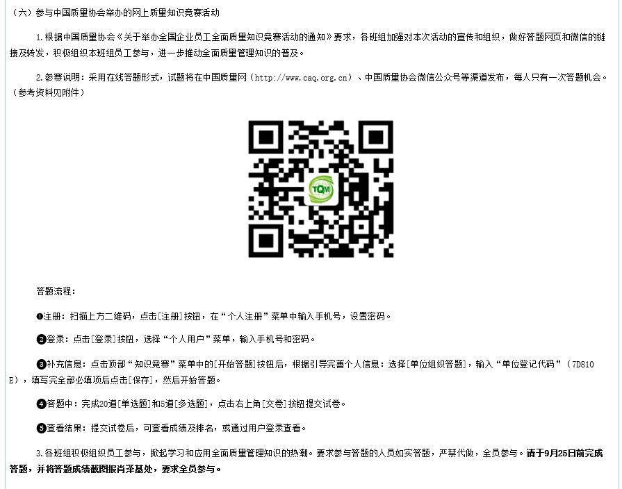 本次竞赛自9月1日正式启动,将持续至11月30日,采用线上答题的方式进行。竞赛内容涵盖全面质量管理的核心知识与实际应用,共设25道题目,包括20道单选题和5道多选题,旨在检验并提升员工对质量管理体系、工具与方法等方面的理解与运用能力。
