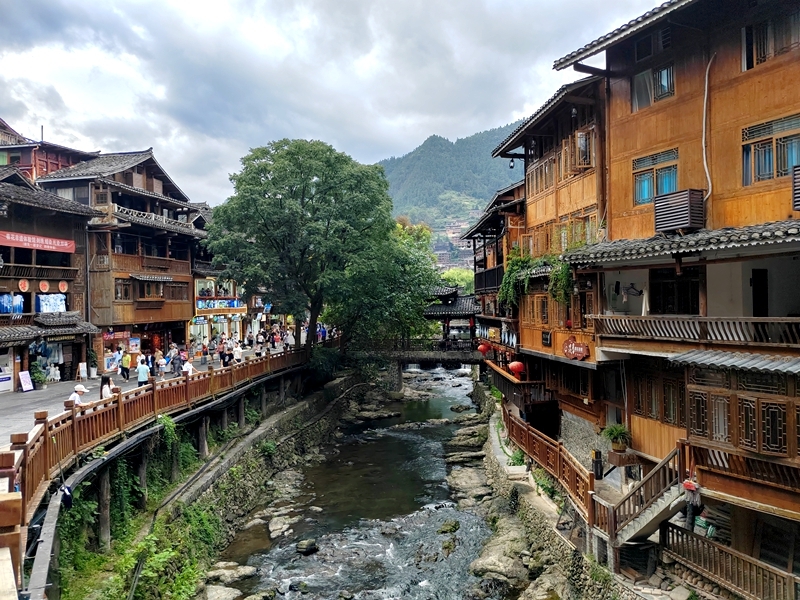苗寨的每一条溪流上,都架着造型别致的风雨桥。这些桥不仅是通行的通道,更是村民休憩、议事的场所,桥身绘满苗族图腾,廊檐下挂着红灯笼,古色古香。傍晚时分,常有苗族姑娘穿着盛装在桥畔唱歌,歌声清亮婉转,伴着溪流潺潺,格外动人。若是赶上节日,桥上还会举办拦门酒仪式,身着盛装的苗族同胞捧着米酒,唱着敬酒歌,欢迎远方的客人,热络的氛围让人瞬间融入这片土地。
