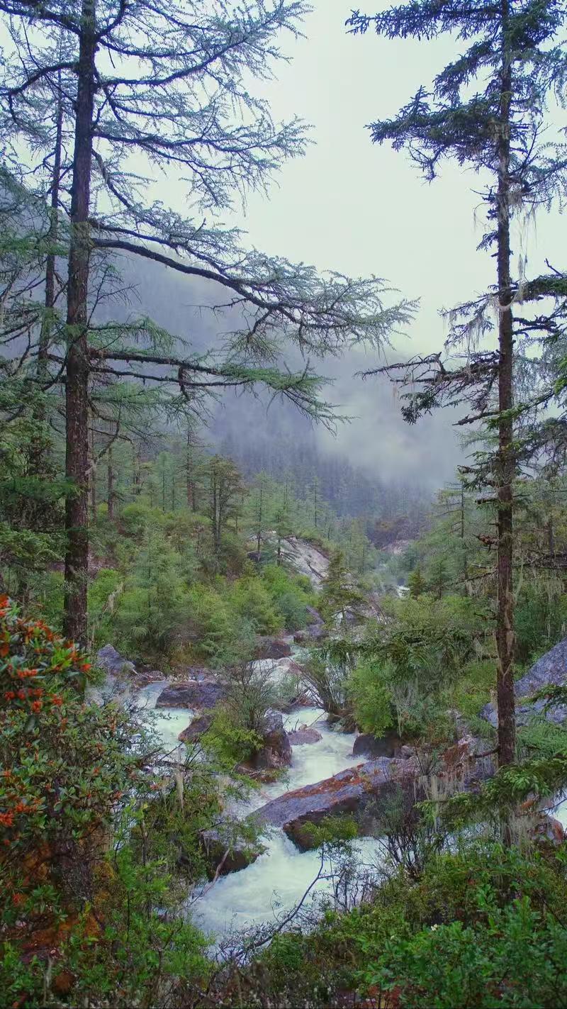 往山上走,腐叶铺的路变得软滑,踩上去能听见“噗叽”的轻响,混着远处不知哪棵树上的鸟鸣——雨停后第一声鸟叫,总带着点清透的脆。路边的野栗子树挂着带刺的绿果,果壳上的水珠滚来滚去,偶尔滴在手背上,凉丝丝的。 站在山梁上时,雾正被风推着走。有时会突然散开片空隙,露出下方深绿的山谷,谷里的溪流像条银线,闪着细碎的光;下一秒雾又涌上来,把山谷重新藏好,只留下满鼻的草木香,混着泥土的湿润气,慢慢往肺里钻。