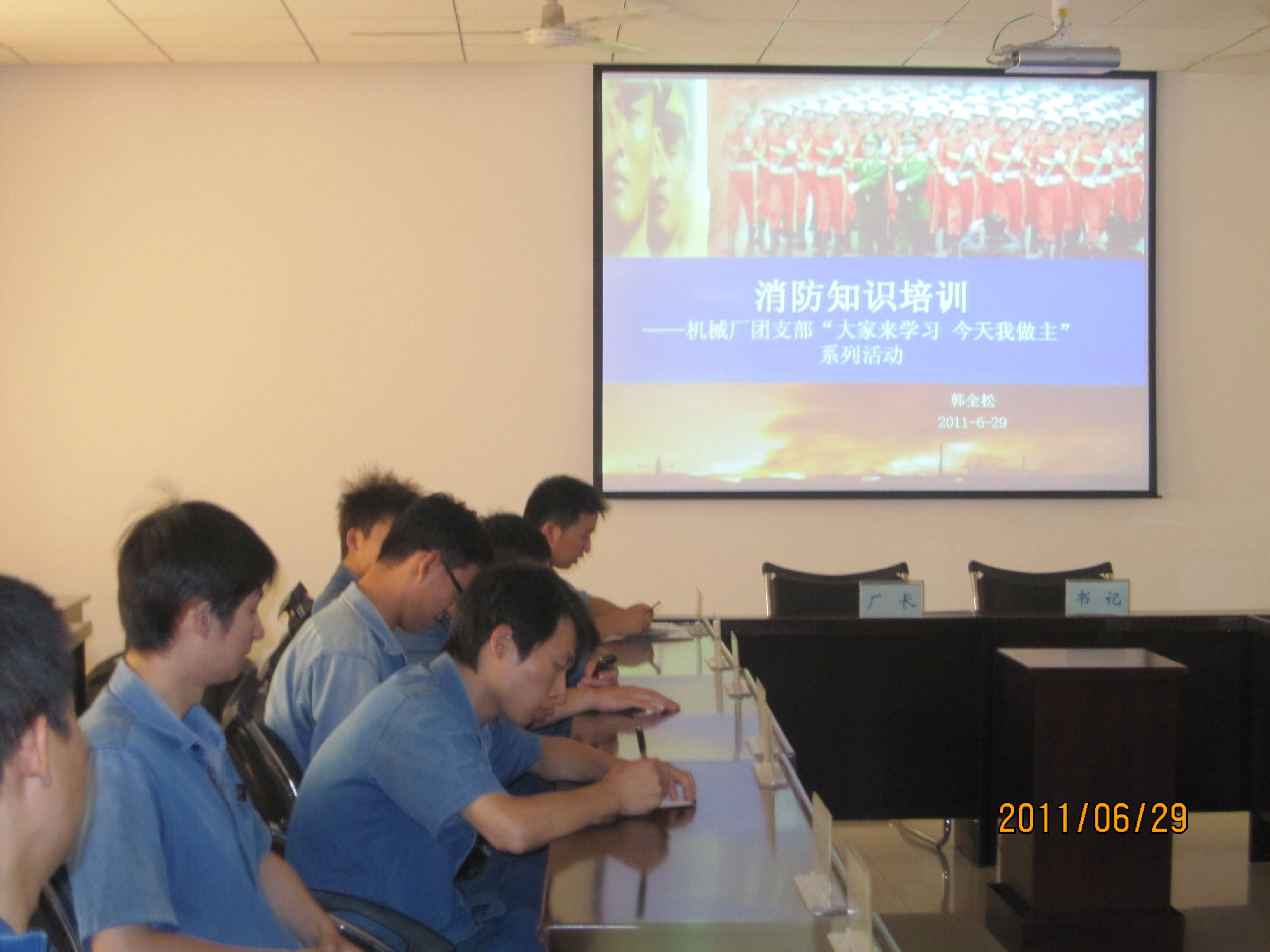 为响应机械厂安全生产活动月号召,增强团员的安全防范意识。6月29日早上,机械厂团支部组织团员在机械厂三楼会议室进行了公司重大危险源及消防知识培训。本次培训由班组安全员韩全松主讲。