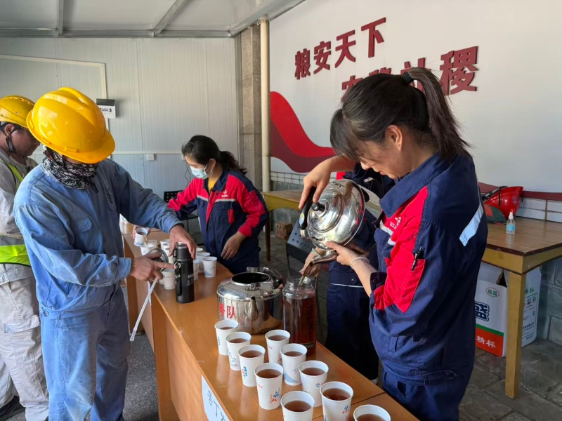 光影里总有温柔的点缀。女职工们提着送水壶来了,她们的身影烈日下、雨幕中都格外惹眼。正午的太阳晒得她们脸颊通红,额前的碎发贴在皮肤上,却笑着把那份“清凉”递到工人手里:“师傅,喝口水解解暑!”雨水打湿了她们的鞋,裤脚还带着装置区溅起的油污,可递水的手却稳稳的,还不忘叮嘱一句“小心脚下”。她们的身影不算高大,却像一束束暖光,落在烈日炙烤的疲惫里,落在雨幕浸透的凉意中。那一杯杯递出去的水,带着手心的温度,把光的暖意,悄悄送进了每个奋斗者的心里。