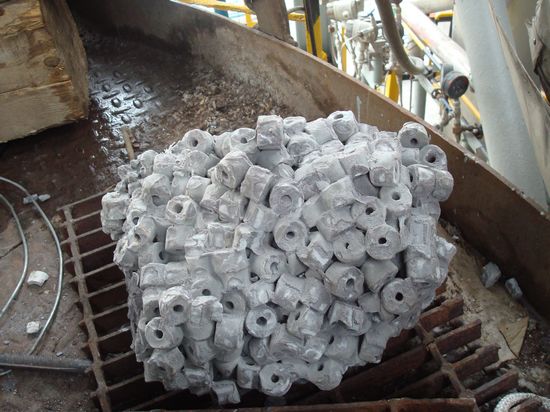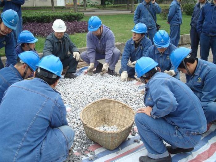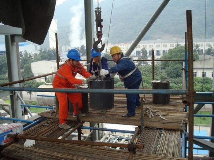 做好前期安全教育等各项准备工作后,56名突击队员进入合成界区,开始触媒卸出工作。突击队员们首先要把催化剂上部的六角砖等全部吊至地面,再把催化剂装入桶内吊出拉走。催化剂层卸完后,再卸出下层的氧化铝球,并吊至地面分类保管。共四层物料总重量达40余吨,要全部卸出其难度可想而知。都说“困难是生命的试金石”,复杂的作业流程,高强度的体力劳动,再加上是在炉内作业,空间狭小,突击队员们行动不便,困难和挑战考验着每一名队员的体力和毅力。但诸多困难,丝毫没有影响大家完成任务的信心和决心,突击队员们从早上8点干到晚上10点,轮番作战,力求用最快的速度完成触媒更换任务。