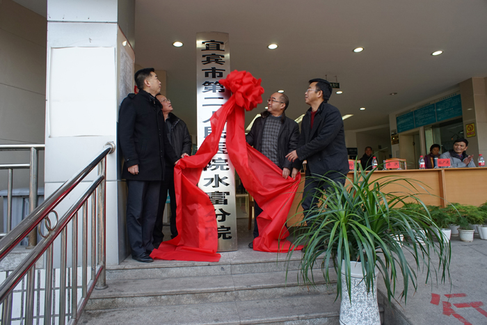 在全场热烈的掌声中,公司党委书记梁洪、水富县卫生局局长杨贵阶、宜宾市二医院院长孙广运、水富云天医院董事长何昌有共同为“宜宾市第二人民医院水富分院”揭牌。
