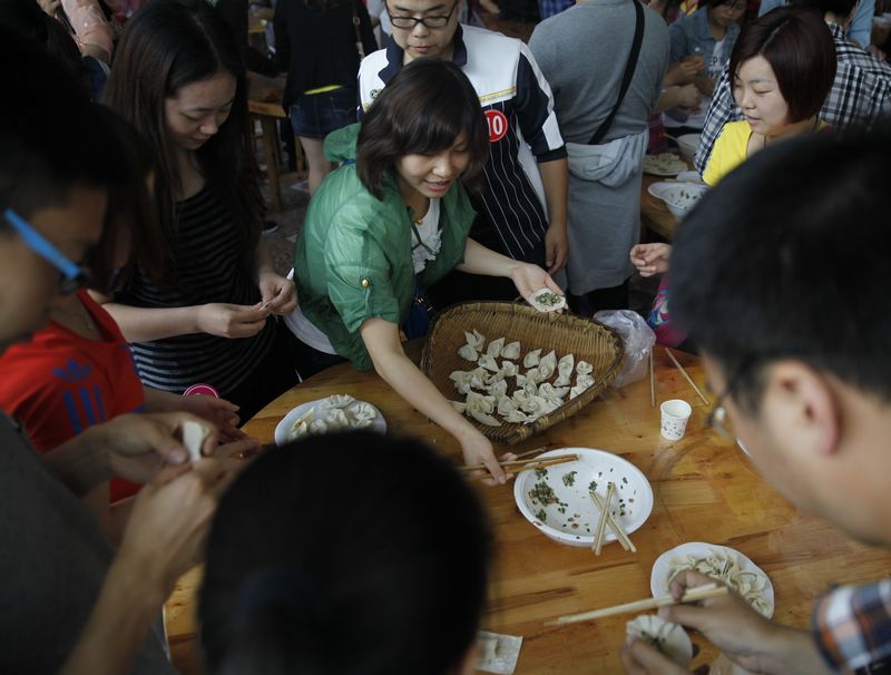 到达目的地后,在主持人的带动下,“吹气球”“跳绳”“吃西瓜”,青年男女们通过一个个小游戏、小活动,展示才艺,表达爱意,将联谊活动逐步推向高潮。男女搭配,干活不累,最有趣的算是包饺子,你放陷来我捏皮,醉翁之意不在酒,更多的是相互交流,一盘盘形状各异的饺子,在一对对临时组成的男女搭档中,不一会儿的功夫就呈现在众人面前,有的还为所包的饺子起了个名与众人分享,有的拿起相机进行合影,以表留念。