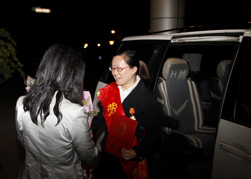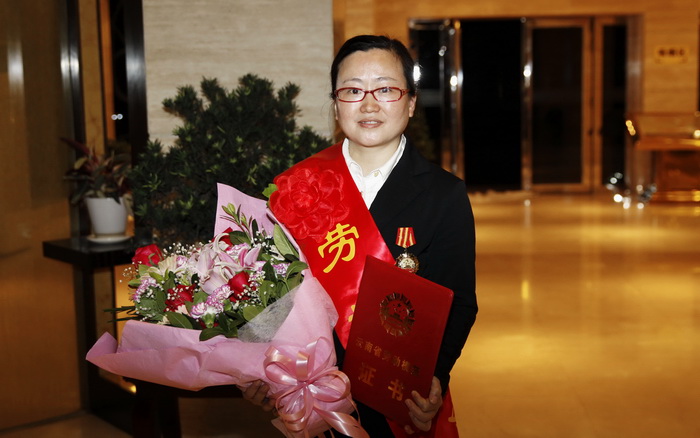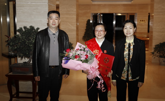当晚10点,当刚从昆明领奖归来,身披绶带、胸佩奖章的劳动模范赵宁回到公司时,工会代表为向她献上了鲜花,公司领导梁洪、宋玉与赵宁亲切握手表示祝贺,称赞她是公司员工学习的榜样,是鼓舞公司员工干事创业的楷模,并与她合影留念。