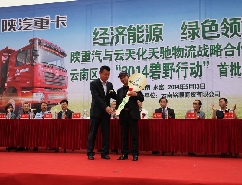 5月13日上午,陕西重型汽车有限公司(简称:陕重汽)与天驰物流有限责任公司(简称:天驰物流)战略合作启动暨云南区域“2014碧野行动”首批LNG重卡交车仪式在云南水富举行。陕重汽销售公司副总经理刘翔韬、昆明办事处主任郑辉,水富云天化党委书记梁洪、常务副总经理陈林,天驰物流总经理任立志、副总经理夏应江,水富县副县长袁伟及相关单位领导参加了仪式。
