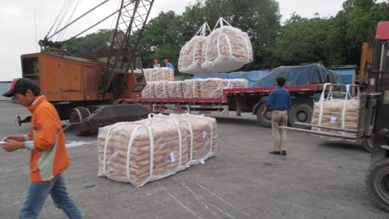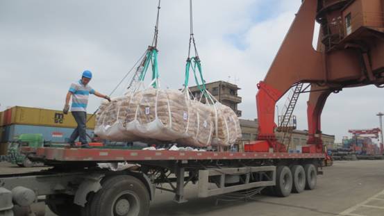 5月24日,在拖车到达码头后,货物由码头吊从船上直接吊到车上,当天便卸好了408吨。