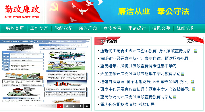 “勤政廉政”是公司党风廉政建设工作的主要宣传阵地之一,在公司党风廉政宣传教育中发挥着重要作用。本次网页改版在模块布局、模块内容、整体色调和视觉效果等多个方面进行了优化和调整,改版后的网页内容更加丰富,栏目更加规范,版面更加美观。网站设有“工作动态”“党纪政纪”“宣传教育”“理论探讨”等栏目,并新增“廉政广角”“清风文苑”栏目,加入了互动地带和廉政动漫,对相关党风廉政内容进行专题宣传。