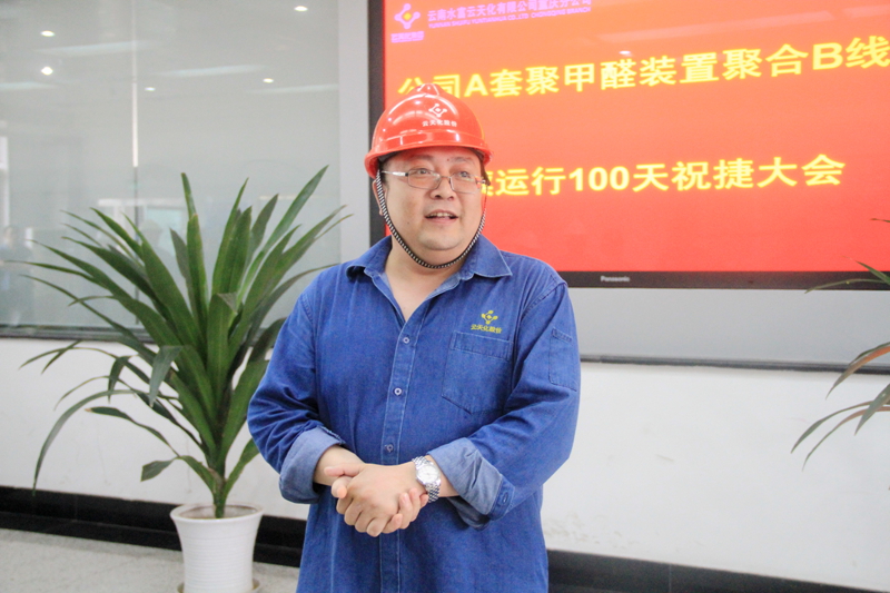 重庆分公司党委书记罗勇在主控室主持A套聚甲醛装置聚合B线连续运行100天祝捷大会。
