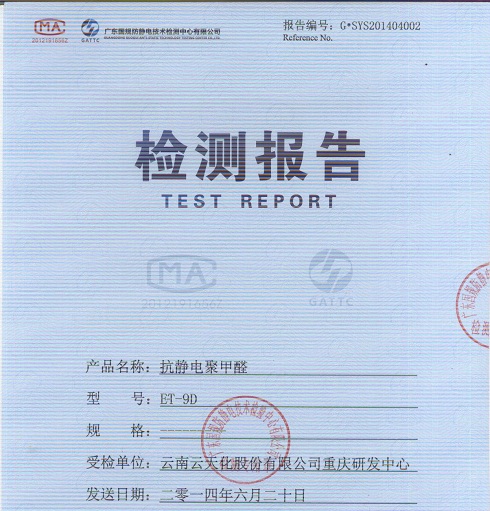 目前,云天化本色抗静电聚甲醛已经通过了两家客户的试用,为进一步推广产品,提供品质保障,我们针对抗静电聚甲醛进行了有检测资质的第三方测试。通过广东国规防静电技术检测中心测试,云天化两款抗静电产品的以上5个项目测试结果均符合国家相关标准及要求,并且符合《电子产品制造与应用系统防静电检测通用规范SJ/T10694-2006》的要求,说明云天化的抗静电聚甲醛已获得进入防静电领域的“通行证”。