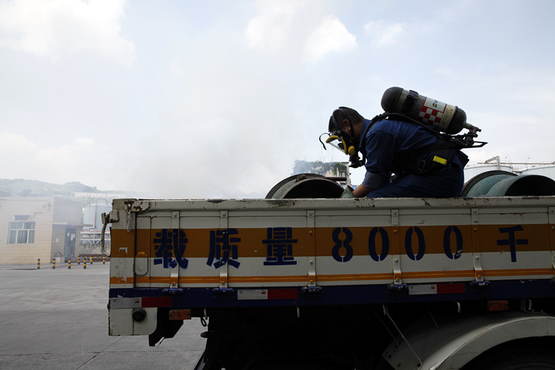 接到报告后,指挥组迅速启动《云南水富云天化危化品运输泄漏应急救援预案》,并赶赴事故现场指挥应急抢险工作。随即,警戒疏散组、消防抢险组、环境监测组等各应急专业组人员迅速赶赴现场,有条不紊的开展抢险救援工作。由于泄漏点无法得到控制,演习指挥组商议决定使用叉车将泄漏钢瓶运送到碱水池进行中和处理,半小时后,事故得到成功处置,险情排除。