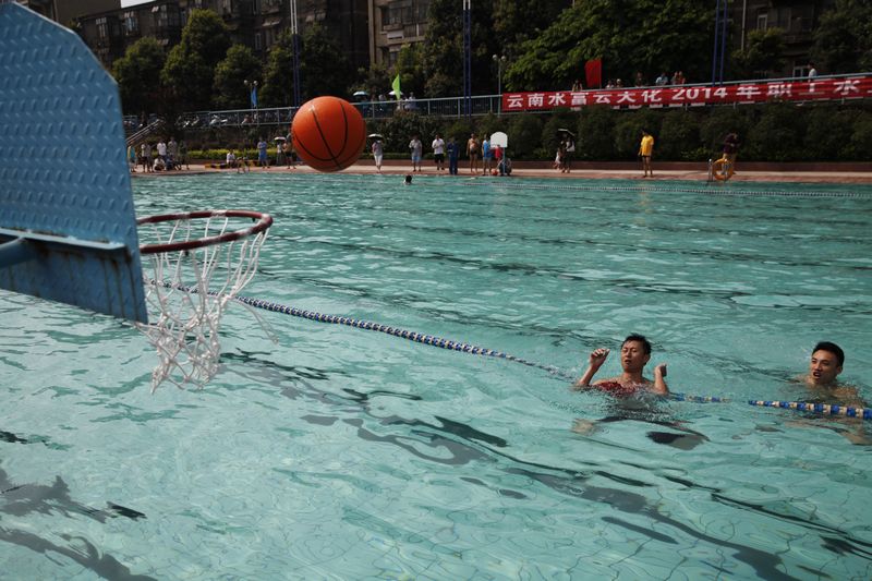 水上篮球比赛在往年比赛规则上进行了改进,以前是三人制比赛,要求在规定时间之内,一人投篮,两人运球;今年是采取五人制,一号选手游至投篮点,二号选手运球给一号选手,一号选手投篮一次后捡球上岸,将球传给三号选手,三号选手再从手中运球给二号选手投篮,直至五号选手投篮结束。最后根据比赛用时和进篮个数决定胜负。从当天的比赛看,水中投篮不比陆上,命中率较低,当然醉翁之意不在酒,乐在参与。
