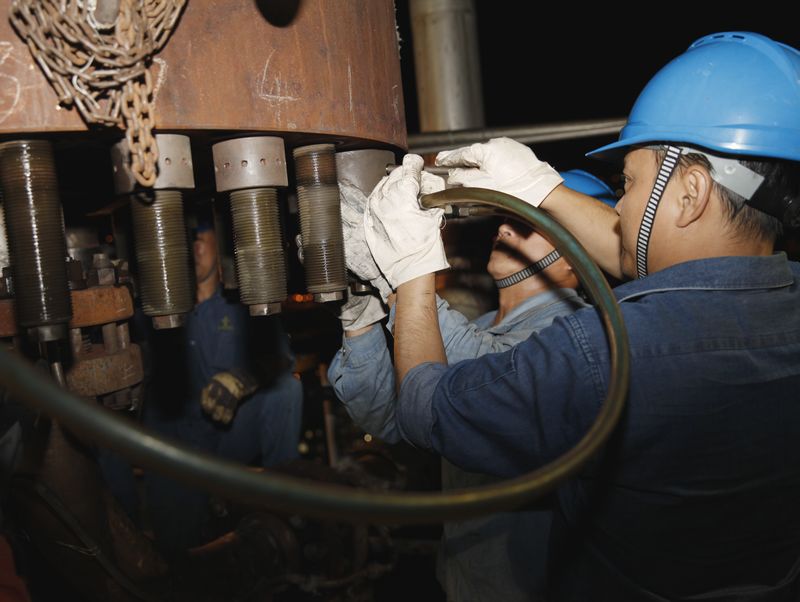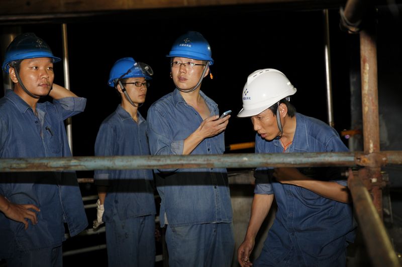 根据氨罐液位,此次203C抢修,依然安排在深夜。夏日凌晨的夜空是静谧的,尿素装置现场却是热闹的,先是工艺人员楼上楼下穿梭于装置中,其次是203C处,叮叮当当的响声不断,吆喝声时时传来。对于承担主要抢修任务的机械厂铆工班全体人员来说,虽然是轻车熟路,却不可掉以轻心,当晚11时许,根据工艺停车进度,他们就提前抵达现场,接好线,搭好架子,准备随时开工。