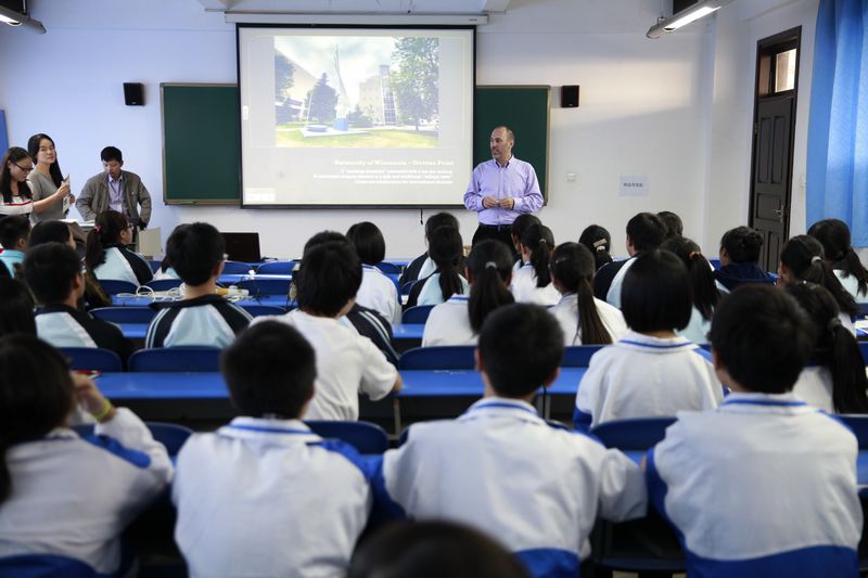 签约仪式前,云天化中学校长黄林向美方代表Dr.Brad Van Den Elzen介绍了云天化中学的办学历史、办学现状、以及学校国际化发展目标。Dr.Brad Van Den Elzen高度赞赏了云天化中学“育人为本”的办学理念,以及各项推进学生全面发展和个性发展的举措。Dr.Brad Van Den Elzen向云天化中学介绍了美国威斯康辛州立大学史蒂文斯庞特校区办学情况。经过磋商,双方一致表示:愿本着友好、平等、互相尊重的原则,开展双方学校之间的交流与合作,并对学校间短期游学及文化交流项目、教师培训、以及云天化中学学生留学等方面意见达成一致。