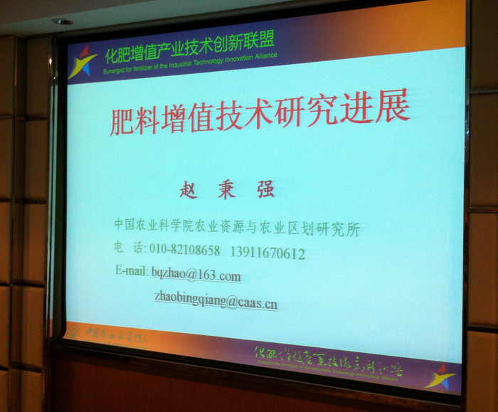 赵秉强博士首先对我国氮肥利用率偏低和施肥导致的污染情况进行介绍,指出“发展增值肥料,提高肥料利用率”是化肥产品发展的必然趋势。随后,他还对增值肥料的概念进行了讲解,对锌腐酸尿素、海藻酸尿素、禾谷素尿素、锌腐酸磷酸二铵等多种新型化肥产品从肥效机理、工艺技术、作物试验、市场销售等方面进行阐述,深入浅出的将实验原理与生产实践相结合做了全面介绍,并解答了参会人员从不同角度提出的各种问题,最后双方交流在热烈而友好的气氛中结束。