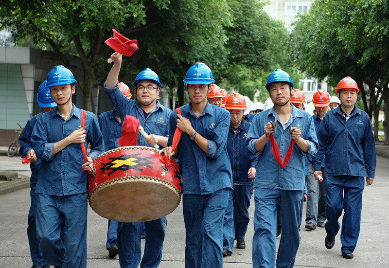 在欢庆锣鼓的带领下,公司领导陈林、梁洪、曾家其、杨志,各副总工程师及中级管理人员前往合成车间祝捷。