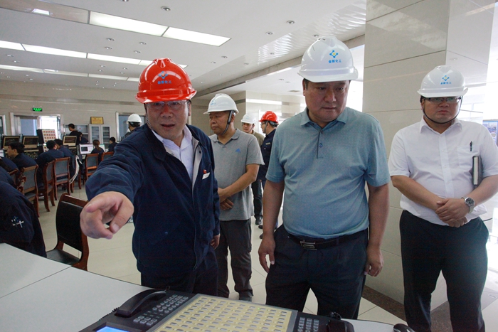 在金新化工党委书记陈大文、副总经理张环的陪同下,布仁贝尔一行先后来到金新化工油品罐区、氮肥主控室,对金新化工危险化学品存储、事故应急预案、安全生产责任制等事项进行了实地检查,并听取了陈大文关于生产设备安全运行、安全防护措施落实、事故应急演练等情况的汇报。