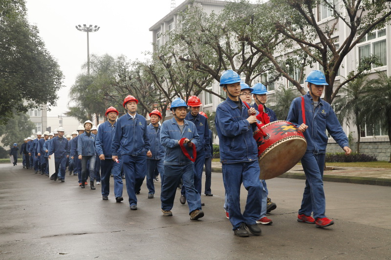 上午9点30分,祝捷队伍从公司厂大门出发前往合成车间祝捷。