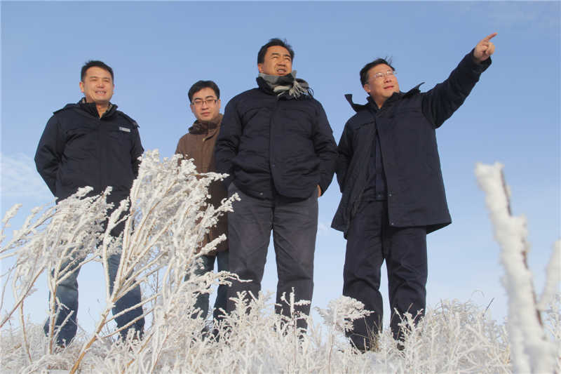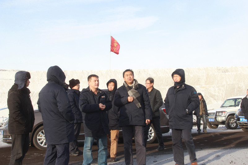 明大增一行在金新化工党委书记陈大文、东明矿业总经理汪云川、金新化工安全环保总监王伟、东明矿业副总经理陈俊彬及相关人员的陪同下,严寒天气里,现场查看了矿坑、排土场、煤场等现场安全环保工作情况。