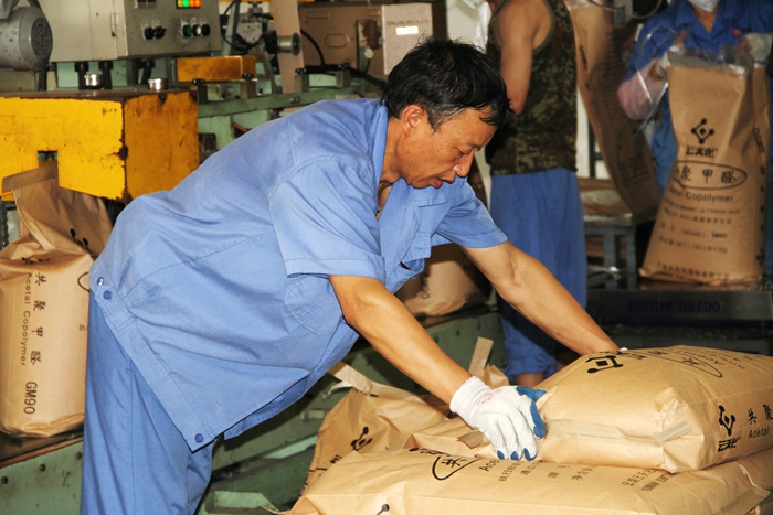 公司包装厂房包装工人正在包装生产好的聚甲醛成品
