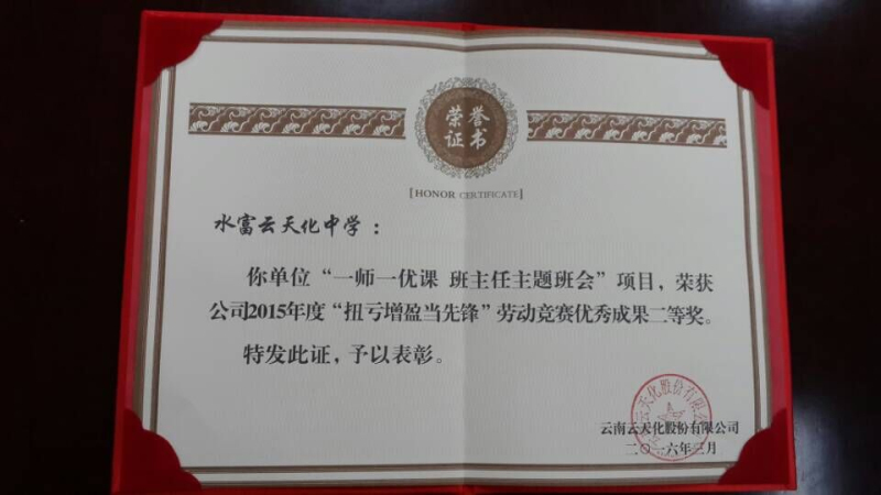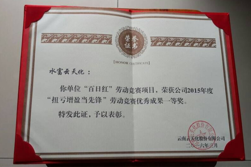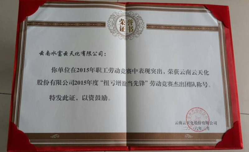 富有成效的工作受到了上级工会的认可。在此次表彰中,水富云天化荣获2015年“扭亏增盈当先锋劳动竞赛杰出团队”称号,水富云天化工会荣获2015年“扭亏增盈当先锋劳动竞赛优秀组织奖”;公司本部“百日红”劳动竞赛获“优秀成果一等奖”;云天化中学“一师一优课 班主任主题班会”和原聚甲醛车间“建功在企业 和谐促发展”两个劳动竞赛项目获“优秀成果二等奖”;成运部“改变发运模式 降低运输成本”、物资部“强化采购管理深挖掘 发挥优势降成本” 劳动竞赛项目获“获优秀成果三等奖”。