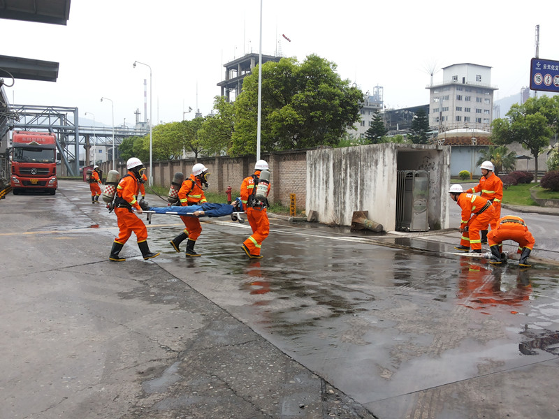 演练模拟汽车充装甲醇时,因车辆故障或其它原因导致甲醇发生大量泄漏。下午15时许,成运部酸碱站现场操作人员在充装操作时发现甲醇意外大量泄漏,同时有操作人员昏迷,工作人员紧急切断现场阀门后迅即拔打公司内部急救电话报警。不到5分钟,公司应急救援分队队员抵达现场,指挥部先安排两人佩戴空气呼吸器进入现场侦查,随后组织队员救出昏迷人员。在判断清楚事故状态及风向后立即安排消防人员对泄漏点进行大量喷水以防燃烧爆炸,并及时疏散相关人员,把守主要路口防止无关人员进入界内。经过约十分钟的抢险抢救,最终将泄漏甲醇全部稀释,事故处理水妥善回收。现场抢险结束后,救援人员在临时指挥部集合,清点人数并汇报总结情况,应急救援分队领导宣布演练结束。