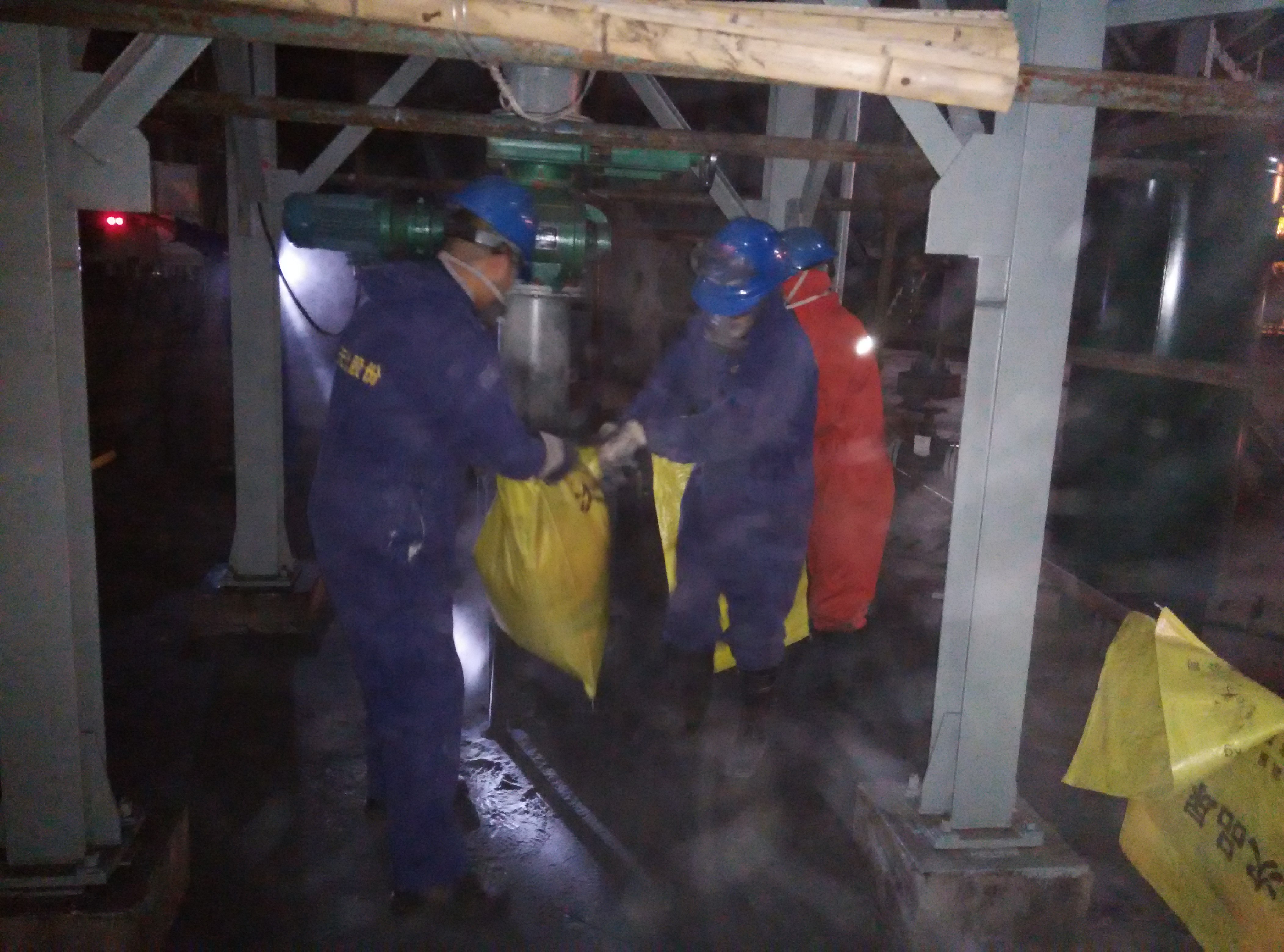 4月24日晚上8时,制醇车间组织进行气化炉环形空间清灰工作。本次清灰首次投用抽灰装置以检验效果。在技术员的指导下,建立好系统真空度和反吹系统,将抽灰吸入后放入灰中,不一会儿功夫,大面积的飞灰就吸入抽灰装置,然后进行间断放料装袋。制醇车间气化炉清灰器主要由真空泵和袋式过滤器组成,直接安装在1楼,可在停车期间直接对气化炉A3/A5/A15等位置进行清灰处理。