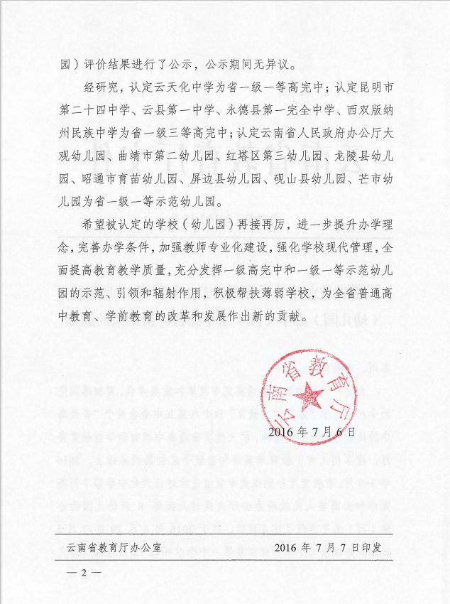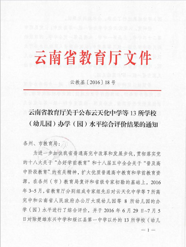 2016年7月7日,省教育厅正式发文,认定云天化中学为省一级一等高完中。