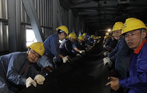 有序的分布在栈桥上,他们中有的是部分生产一线倒班员工,放弃休息,主动回到抢修现场,大家齐心协力,奋战在输煤栈桥上。由于V48110A输煤皮带停止运行后,皮带上积存了部分原料煤,皮带的重量也随之增大,再加上输煤栈桥坡度较大,这给皮带牵引工作带来了较大难度。困难面前,突击人员迎难而上,他们在指挥者响亮的口哨声下,喊着整齐的口号,一点一点地移动、传递着皮带,他们身姿矫健、步调一致、干劲十足,努力将皮带拉回框架中。