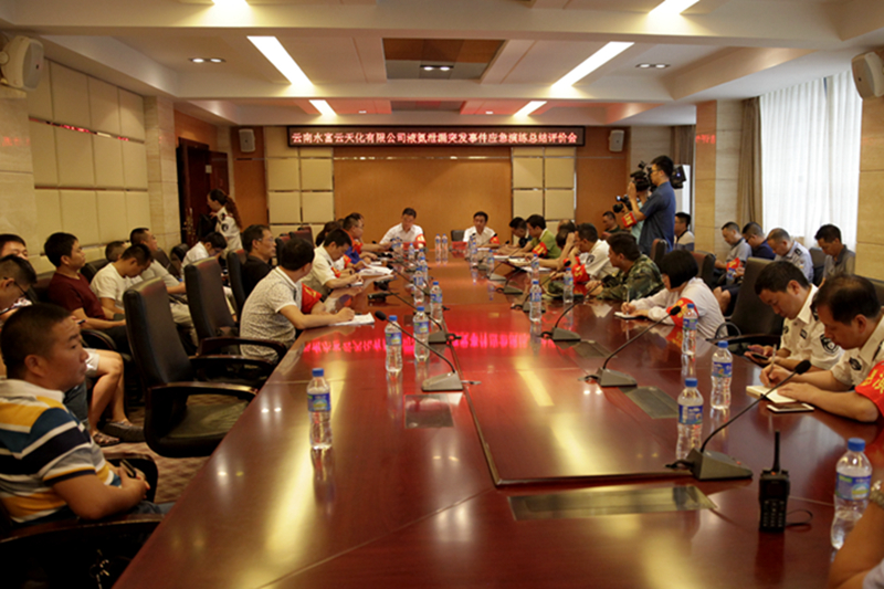 演练结束后,昭通市环保局、水富县政府在云天宾馆一会议室召开了液氨泄漏突发事件应急演练总结评价会,昭通市环境保护局局长童世新,水富县委副书记、县长高绍周,公司总经理陈林,党委书记梁洪等领导参加会议。
