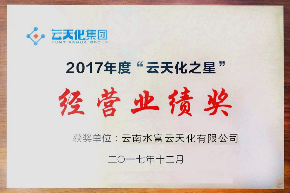 2017年12月26日,集团公司在总部隆重举行2017年“云天化之星”先进集体和优秀管理者颁奖典礼,大会表彰了一年来集团所属各单位在改革攻坚、生产经营、管理提升、创新创效等方面涌现出的先进集体和个人,水富云天化获“经营业绩奖”先进集体表彰,公司甲醇车间主任宋立强、甲醇车间工艺四班班长张顺福获评“优秀基层管理者”称号。