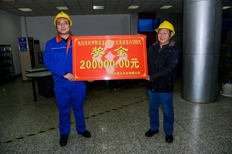 股份公司安环监督部部长纳志辉代表股份公司向公司颁发奖金并宣读贺电。纳志辉谈到,水富云天化甲醇装置安全稳定连续运行100天,是水富云天化持续增强大型煤化工装置运行管理能力的具体体现,也是水富云天化生产管理水平的新提升、新突破。水富云天化是云天化的发源地,也是云天化“百日红”精神的诞生之地,希望水富云天化继续弘扬云天化“百日红”精神,继续弘扬云天化“安、稳、长、满、优”的长周期文化,始终坚持精益生产、达于至善的生产管理理念,以奋斗者为本,以价值创造者为本,坚定信心,乘势而为,以更加优异的工作成绩,为全面实现2018年生产经营目标而努力!