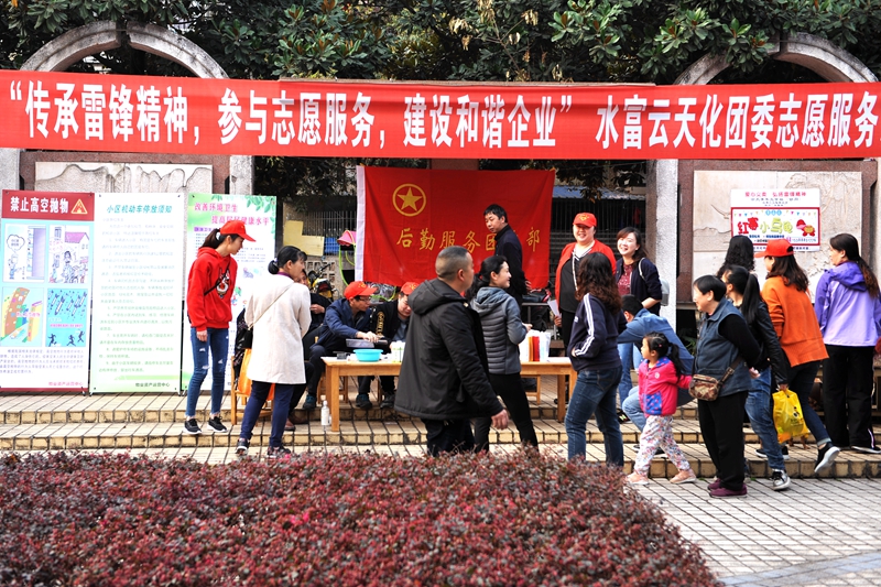 来自公司各单位、云天化中学教育公司、聚甲醛产品事业部水富分部、宜宾市第二人民医院水富分院(云天医院)、宜宾口腔医院、宜宾优视眼科医院、水富县医保局等17个单位186名志愿者参加了本次学雷锋集中志愿活动。活动以小家电维修、教育咨询、商品义卖、好书推荐、零钞兑换、刀具打磨、皮衣擦拭、健康义诊、电脑维护、上门服务等多种形式展开。