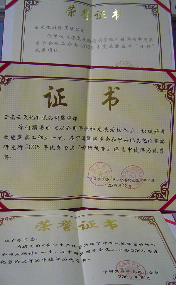 另外,股份公司监审部撰写的《以公司管理和发展为切入点,积极开展效能监察工作》一文,在中国监察学会和中央纪委纪检监察研究所2005年度优秀论文评选中被评为优秀奖。股份公司监审部张有芳撰写的《在企业生产经营活动中开展效能监察的作用和难点探讨》一文,获中国监察学会化工分会2005年度优秀论文奖。