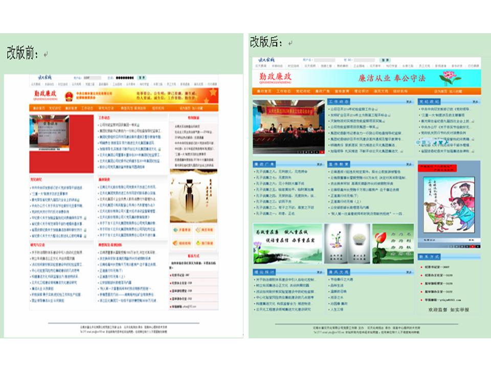 为达到更好的宣传效果,公司纪委办联合信息中心、电视台对云天在线勤政廉政网页进行了改版,经过设计、调试和修改,除版面版头画面电视台正在设计调试外,其余改版工作顺利完成,达到预期效果。