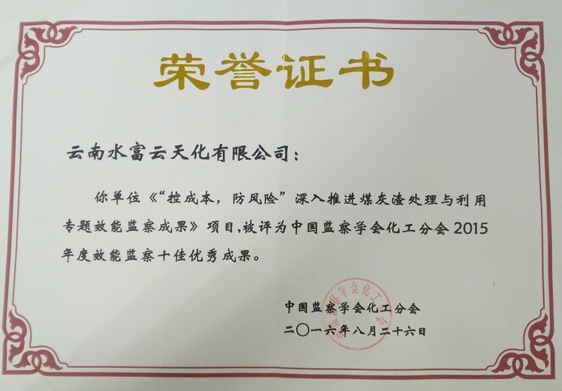 近日,在银川召开的中国监察学会化工分会2016年度年会暨“双优”评选会上,水富云天化“控成本、防风险,深入推进煤灰渣处理与综合利用专题效能监察” 项目获评年度十佳优秀效能监察成果,公司并在会上进行交流发言。