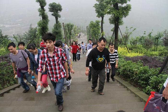 5月13日上午9:30,按照活动时间安排,参加活动人员集合于长寿古镇正门处,经过分组后,大家开始从长寿古镇步行至菩提山下,在步行过程中,各组成员相互认识、交流、了解,达到新朋友间初步认识的目的。经过步行这一段时间的热身以后,大家已为爬菩提山做好了准备,经过强调安全这一重要注意事项以后,50多名青年朋友向着山顶的方向奔去,一路上,上山的石阶上,滴落了些许汗水,也留下了大家相互鼓励的话语,原本需要一个小时爬山时间却缩短至了不到半个小时,大家就站在了菩提山的最高峰眺望略带薄雾的长寿古镇,山下别有一番景象。为了增加活动的趣味性,团组织在爬山的组织过程设计了“寻找幸运纸袋”环节,使大家在爬山时还有期待和意外获得的喜悦,从而减轻爬山的疲惫。