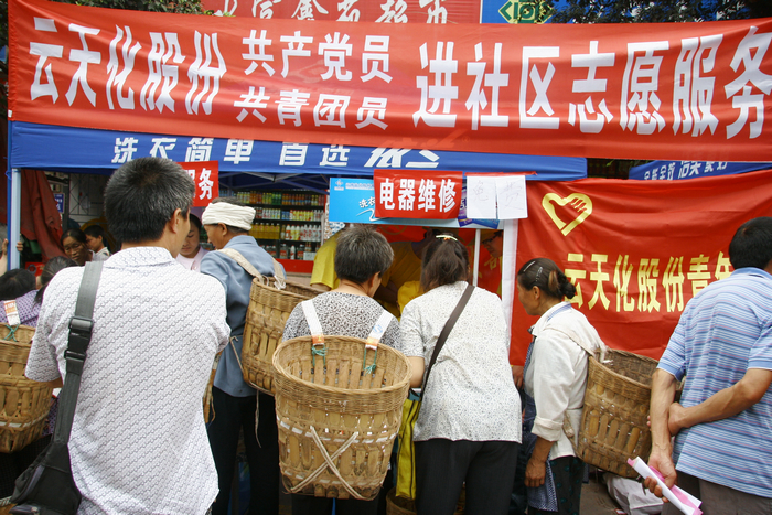 公司此次志愿活动,分别在三个地点开展,包括云天化生活区、楼坝集市、太平集市。7月26日上午,公司团委组织志愿队前往志愿活动第一站----楼坝集市,此次志愿活动共包括电器维修、医疗服务、科普宣传及产品宣传四个项目。