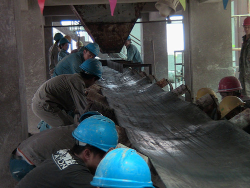 目前转鼓装置大修工作按原定计划积极推进,8月10日,按计划需要完成转鼓装置干燥出口输送皮带和两条原料输送皮带的铺设,其中原料输送皮带的长度分别是46.8m和52m,干燥出口输送皮带为30.3m。由于三条输送皮带与水平面存在15°左右的爬坡倾角,因此对皮带的铺设进程造成一定的困难,为了保证改造进程的顺利推进,团总支即刻组织青年突击队参与到输送皮带的铺设工作中,33名突击队员在检修现场,听从检修人员的统一指挥、团结协作、齐心协力完成了输送皮带铺设工作。