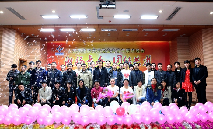 为给驻渝企业青年员工搭建一个增进交流、展示才华的大舞台。12月26日,云天化股份重庆分公司团委、CPIC团委在云天化新材料产业园学术报告厅联合举办了“激扬青春· 团结共进 云天化股份驻渝企业青年迎新联欢晚会”,CPIC、云天化股份重庆分公司、天勤材料、重庆云天化纽米科技、研发中心、天盟连锁重庆分公司、天驰物流重庆分公司的近300名青年员参加了晚会。晚会取得圆满成功。