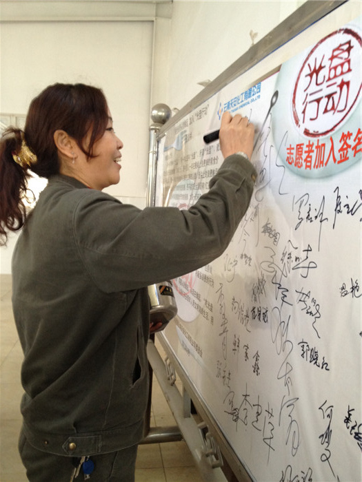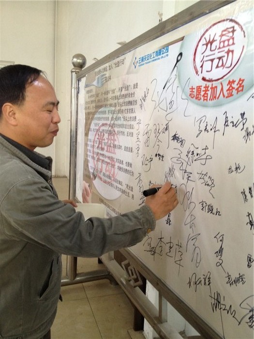 2月22日,在天安化工食堂和现场送餐点,用餐的员工们纷纷来到一份叫做《拒绝浪费从我做起 加入“光盘行动》的倡议书面前,签下了自己的名字,表示加入“光盘行动”志愿者行列,倡导“我光盘,我自豪”。最醒目的是,“罗秀祥、徐怀春、杨开祥”等6位公司领导的名字和若干中级管理人员的名字也出现在了在我们的志愿者签字栏里。