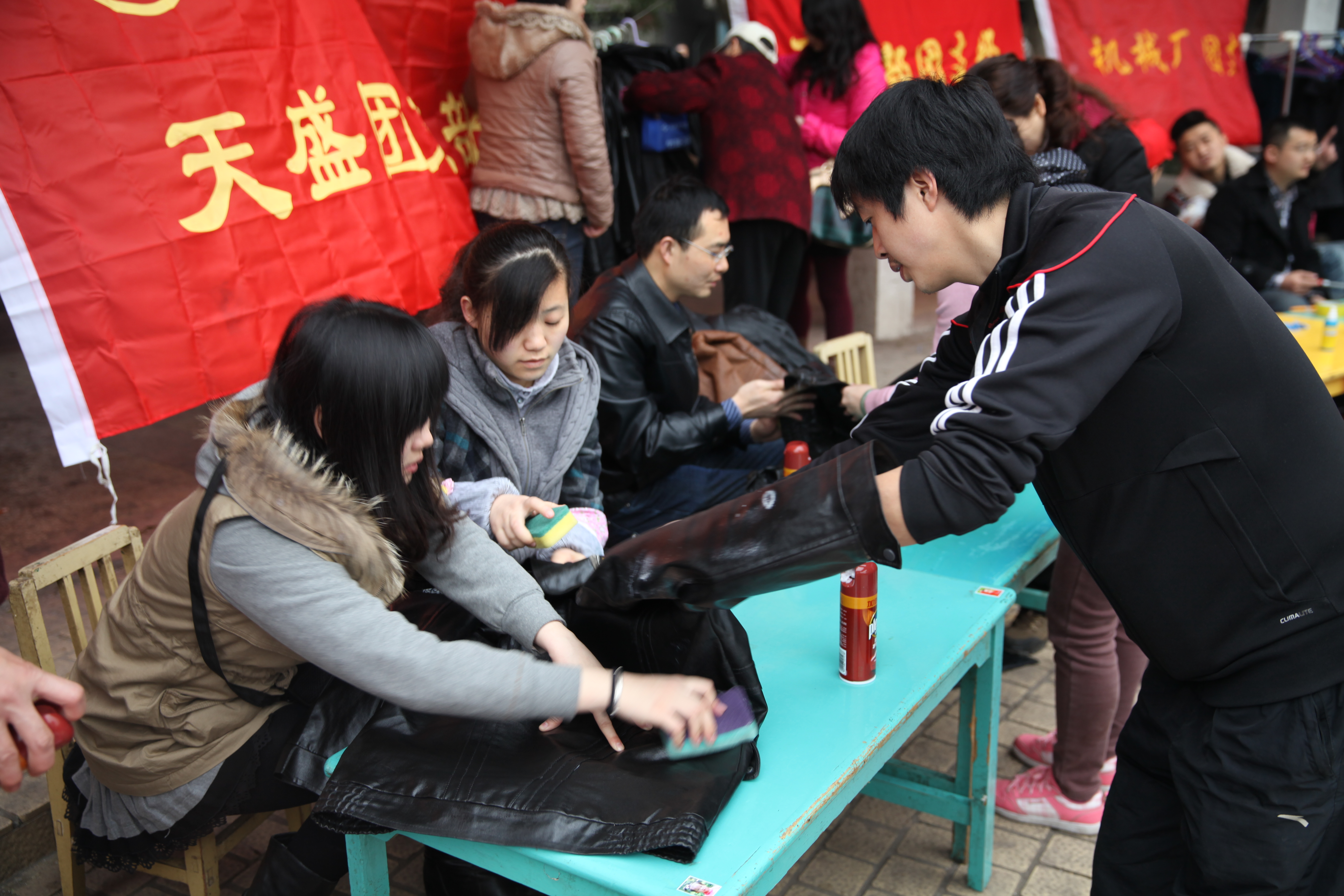 早上8:30,各单位的青年志愿者准时来到文化广场,在各自负责人的带领下开始在自己所在的服务区做服务项目的准备工作,他们有的负责挂团旗、有的负责搬座椅板凳,待一切准备就绪后,便民服务活动随即展开。今年的学雷锋活动在传承往年的爱心义诊、檫皮衣、皮鞋、洗键盘、磨刀、零钞兑换等品牌服务项目外,还创新开展了“倡导节约”志愿者签名活动、雷锋故事会、亲子游戏等服务项目。我们欣喜的看到,在每个服务项目前,都聚集着许多前来参与活动的员工及家属,他们当中除了有老人外,还有许多小朋友。整个活动现场被志愿者们快乐服务的身影和人们的满意的微笑装点着,美好而和谐的画面感染着现场的每一个人。