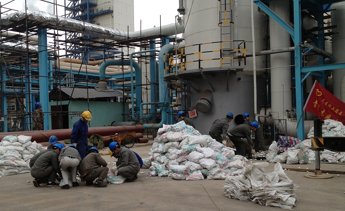 3月5日,正是今年的学雷锋主题活动日,具备青年突击队员和青年志愿者双重身份的青年们准时来到突击现场,大家首先将装填时起支撑作用的惰性氧化铝开孔瓷球,为了避免瓷球破碎,只能一次4袋的倒入新预变炉。为了确保填装质量,大家小心翼翼,工作进度十分缓慢,直到下午7点才完成了11.5T的装填量。可是第二天的任务更加艰巨,比第一天多了约4倍的工作量,突击队员们必须在一天内装填约40T的耐硫变换催化剂,才能确保明天工作的顺利开展。为了确保任务能够顺利完成,团委将当天参战的10名突击队员和志愿者分成了两个小组,轮番上场,坚持工作不间断。当晚上8点,大家终于完成任务,脱掉手套时才发现,无论男生女生,每个人的手上都打出了水泡,衣服里全是粉粒,脸上脖子上又疼又痒,直不起腰来。即使这样,大家的心里也满是自豪,那20个小时的辛苦和劳累都是值得的。