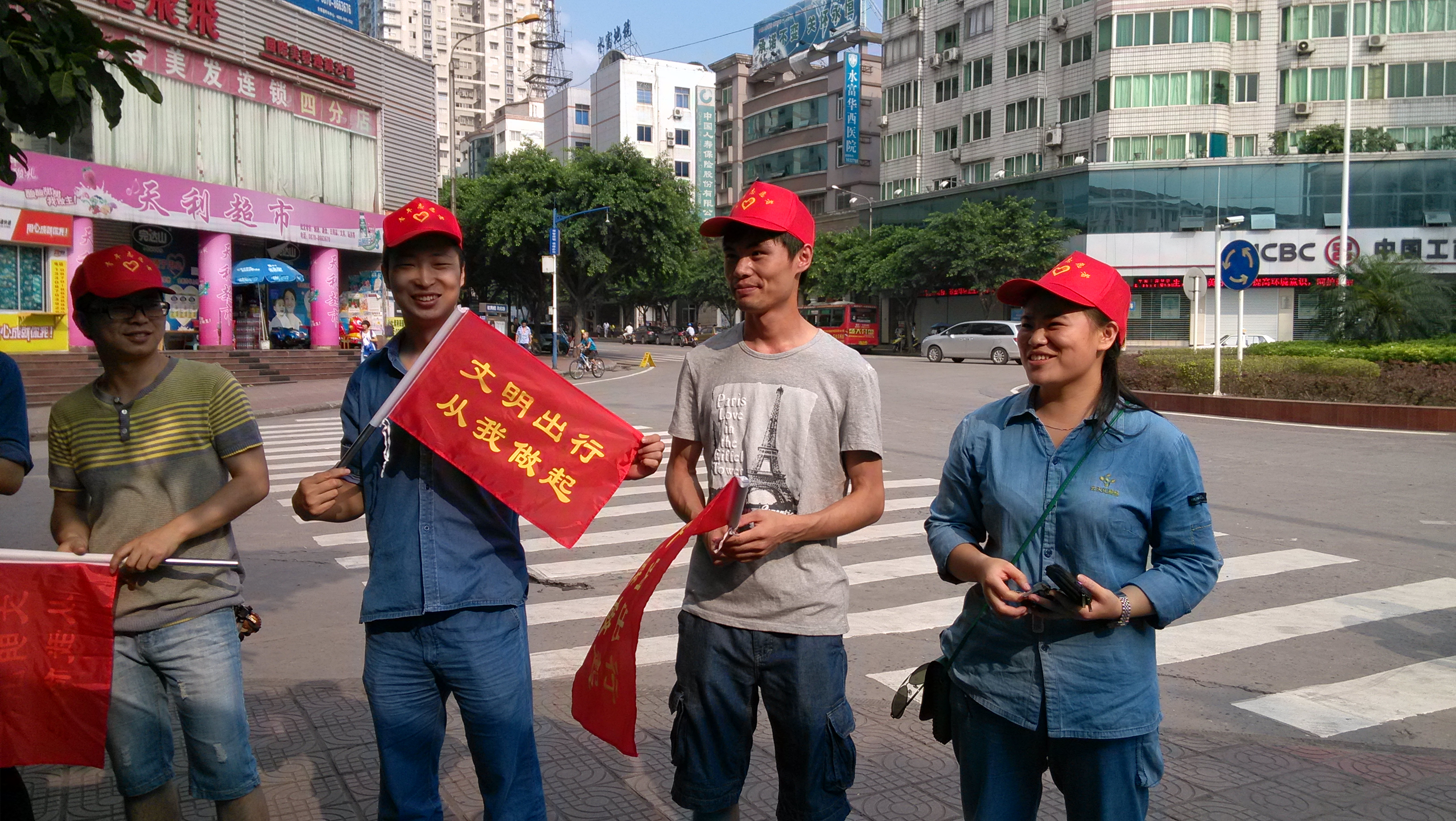 在公司员工和云天化中学放学的高峰期,我们随处可见一批统一佩戴红色青年志愿者帽子的志愿者,正手持着一面印有“文明出行、从我做起”的红色旗帜不时的劝导着一些过马路不走斑马线、未按标识牌停放车辆等不文明现象。公司的青年志愿者们用良好的精神风貌为水富县创建云南省省级文明县城和创建全国卫生县城贡献着力量。