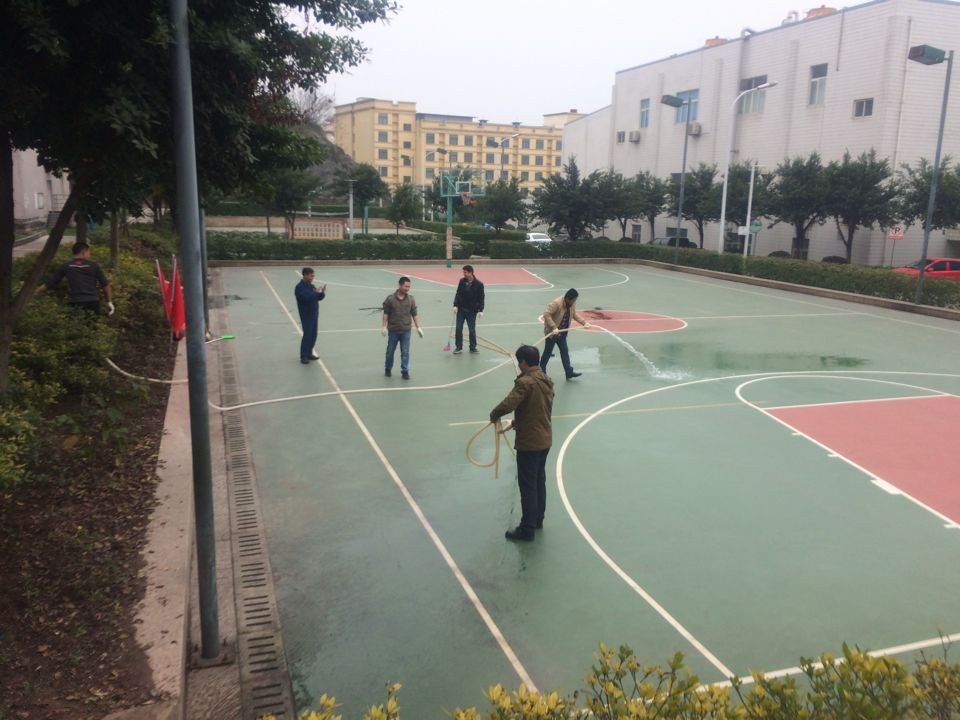 行政团支部负责冲洗园区的两个篮球场,大家各自领着工具,牵着水管,脸上洋溢着幸福的笑容,仔细的打扫场上的每一处角落,尽管湿了鞋袜,汗如雨下也不放过篮球场上的半点污渍。