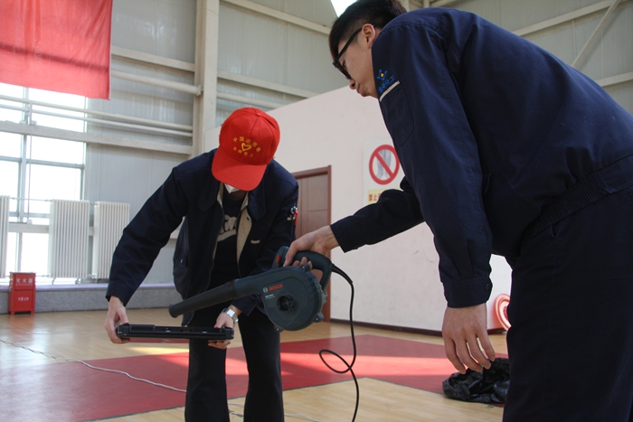 下午14时,来自各团支部的25名青年志愿者带着电脑清洁及自行车维修工机具来到篮球馆,经过简单的分组,挂上青年志愿者旗帜,摆好工具后,小“雷锋”们就投入到了志愿活动中。他们有的用吹风机将电脑内的灰尘清洁干净,有的用清洗剂一遍一遍的擦拭着键盘及屏幕上的污垢,有的在修补自行车车胎,有的为自行车打气,有的正在清理自行车链条,大家忙得不亦乐乎,现场热闹非凡。为了方便倒班员工办公电脑的清洁,公司团委特别组织两个青年志愿者服务队深入生产一线,为办公电脑进行清洁,受到了员工的好评。
