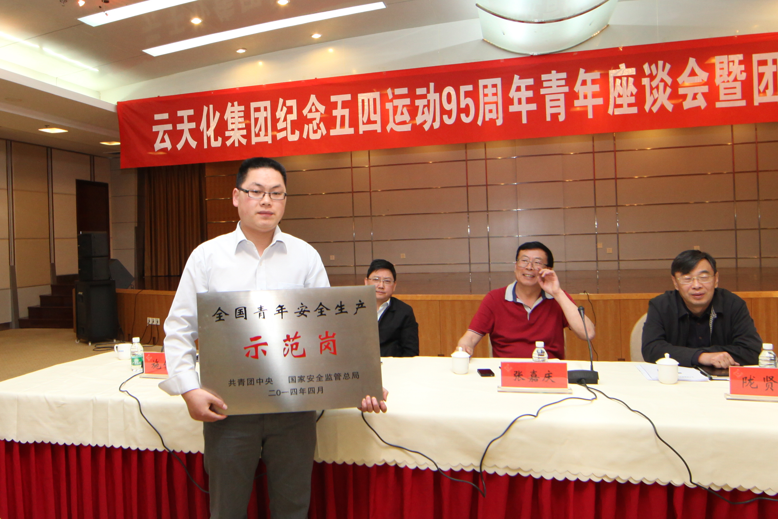 2014年5月9日上午,在云天化集团纪念五四运动95周年青年座谈会暨团内先进表彰大会上,中心化验室煤化工分析班同时荣获了国家级和云南省青年安全生产示范岗,云天化集团总经理张嘉庆为创建集体负责人颁奖。此殊荣是水富云天化乃至集团公司团委开展创建青年安全生产示范岗活动以来首次荣获的最高级荣誉奖项。
