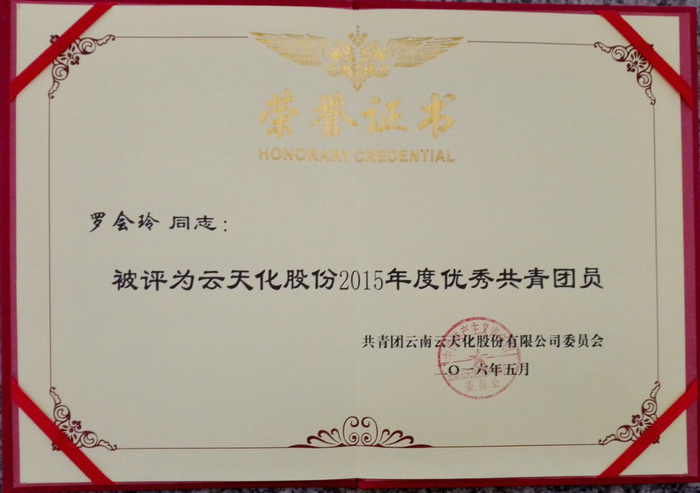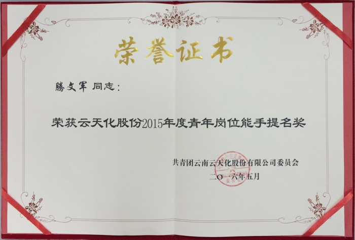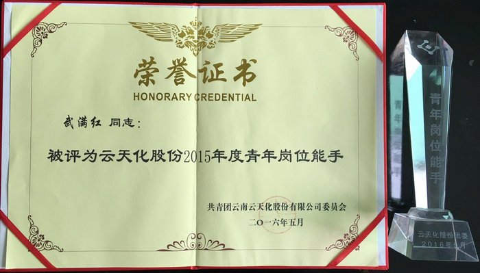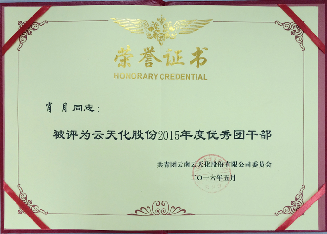 表彰会上,水富云天化第一联合支部(原尿素团支部)、金新化工生产运营中心团支部荣获2015年度股份“先进团支部”称号;水富云天化团委委员周龙、金新化工设备管理中心团支部书记肖月荣获2015年度股份“优秀共青团干部”称号;水富云天化团委委员罗会玲、东明矿业水文地质技术员郭旭荣获股份2015年度“优秀共青团员”称号;水富云天化化肥车间武满红荣获股份2015年度 “青年岗位能手”称号;金新化工检修维护腾文军荣获股份2015年度 “青年岗位能手”提名奖。