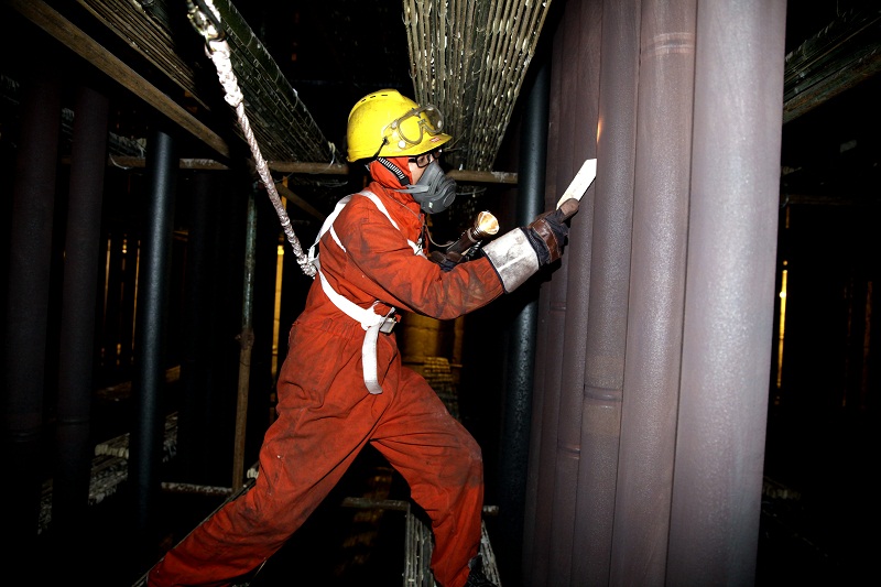 08:30,25名突击队员在完成安全教育后,穿戴好安全帽、安全带、防护服和口罩等劳动保护用品,手拿钢丝刷,身跨手电筒井然有序的进入设备内部。在炉管清刷工作中,突击队员们面对空间狭小、作业强度大、环境恶劣等诸多困难,毫不退缩、并肩作战,奋力挥动着手中的刷子对高11米、直径10厘米的炉管进行360度的清刷,全方位清除炉管表面沉积的炭黑、绣屑等。随着污垢被纷纷刷落,炉管越来越干净,而突击队员们的脸上、手上被一层层的灰尘覆盖,早已看不出本来的面目。为了能够尽快完成突击任务,队员们在吃过工作餐后只进行了10分钟休息调整便又主动投入“战场”,最终于14:30,圆满完成了合成一段炉炉管的清刷任务,并验收合格。